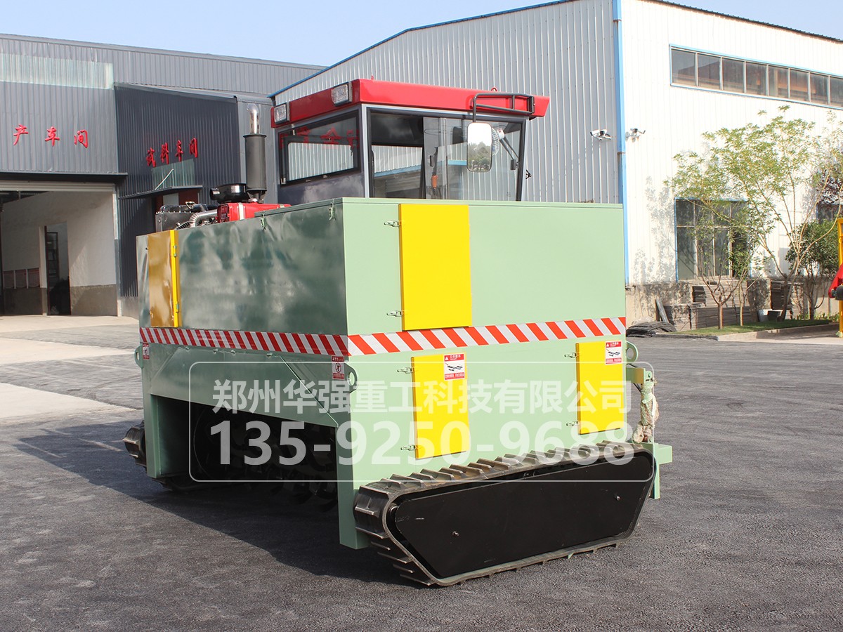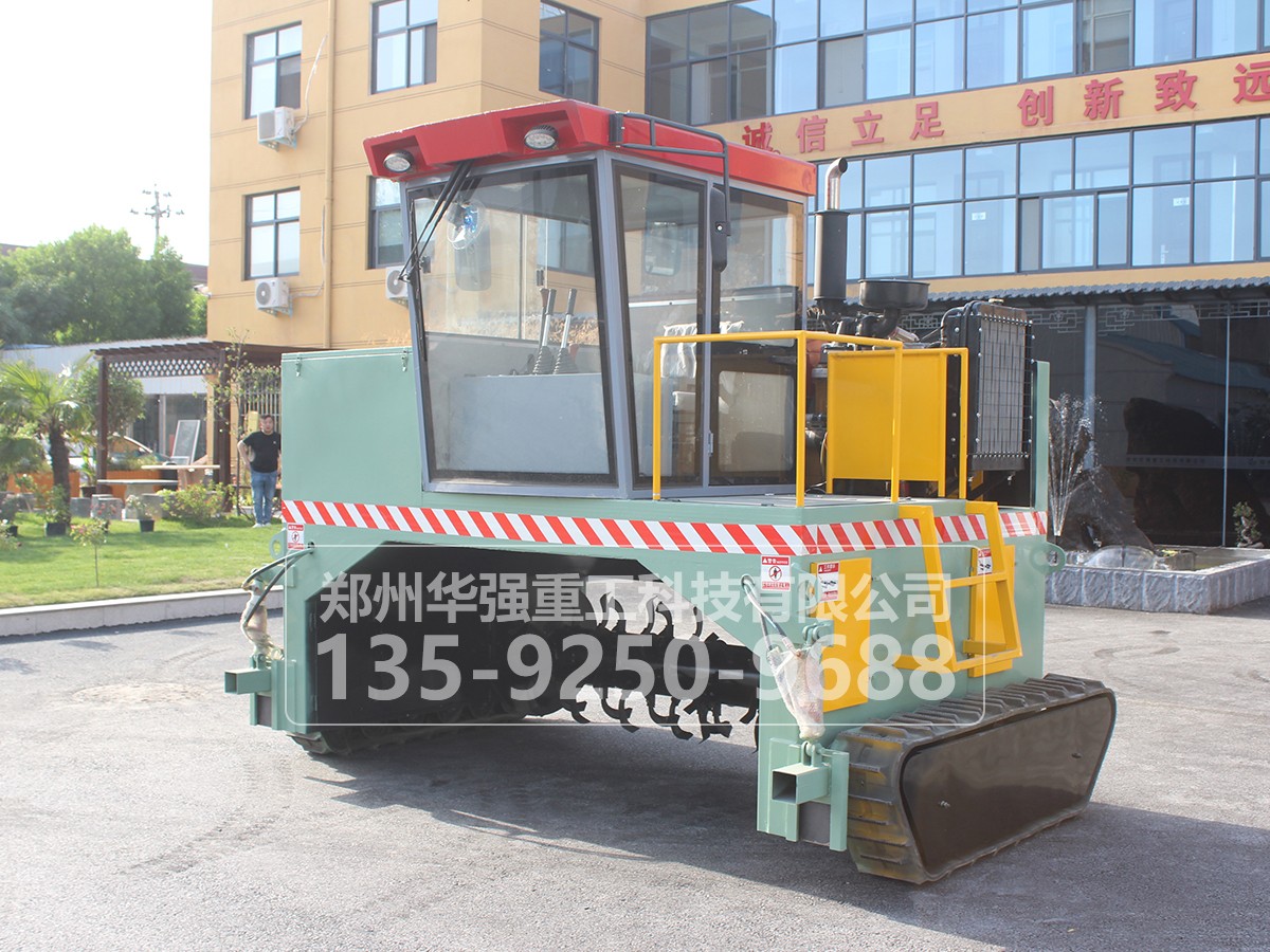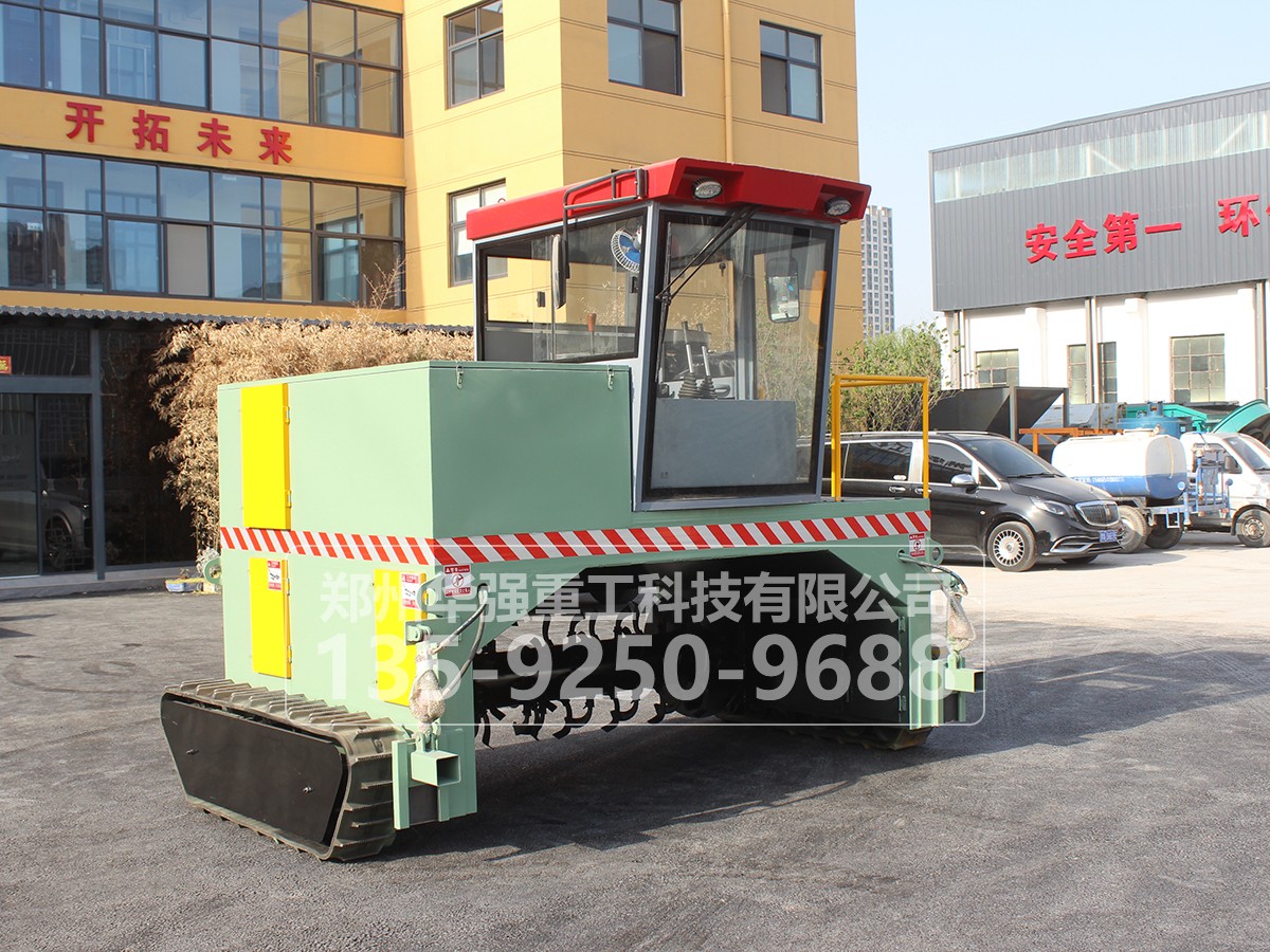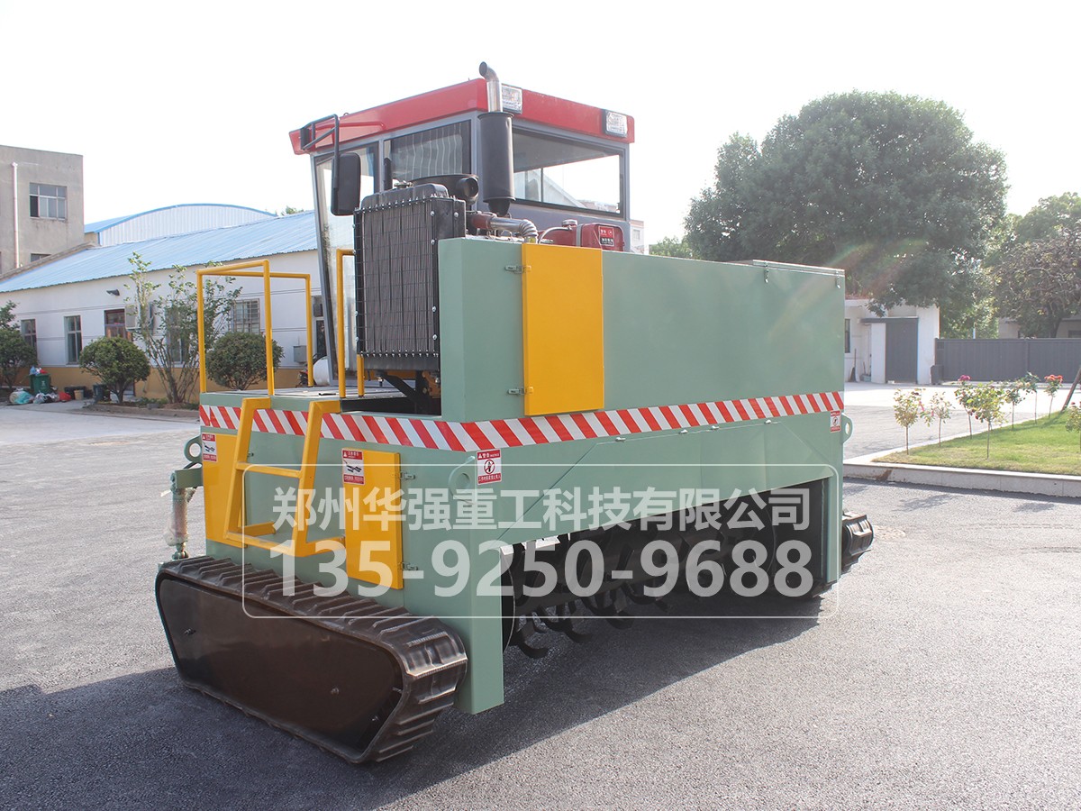 履帶式翻拋車采用履帶式設(shè)計(jì),可前進(jìn)、倒退、轉(zhuǎn)彎,由一人操控駕駛。行駛中整車騎跨在預(yù)先堆置的長(zhǎng)條形堆體上,由機(jī)架下掛裝的旋轉(zhuǎn)刀軸對(duì)堆體原料實(shí)施翻拌、蓬松、移堆,車過之后篡成新的條形垛堆。即可在開闊場(chǎng)地,也可在車間大棚中實(shí)施作業(yè)。