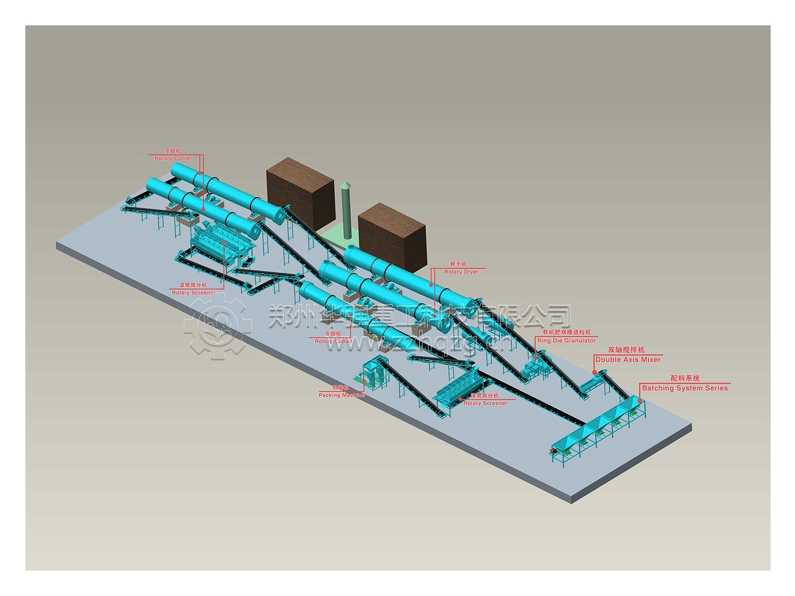 生物有機肥生產(chǎn)線專用肥制作過程中,根據(jù)不同土壤狀況及不同作物,添加無機養(yǎng)分以及濃縮有機質(zhì)和微量元素性的礦物質(zhì),使肥料中含有多種植物生長所需的營養(yǎng)元素如氮、磷、鉀、鈉、錳、鋅、銅等。根據(jù)配方將氮、磷、鉀及發(fā)酵好的物料進行電腦配比攪拌,輸送至造粒機進行造粒。有機與無機原料的配方按不同系列產(chǎn)品進行混合。在攪拌機內(nèi)充分混勻。