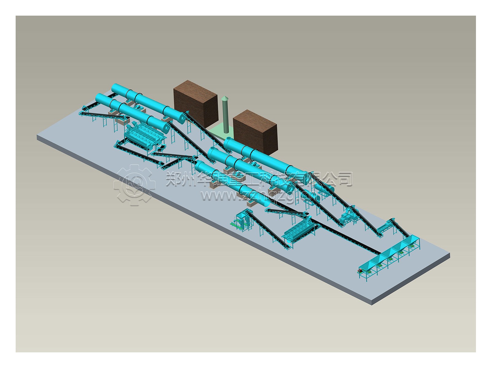 生物有機肥生產(chǎn)線用于生物肥料的生產(chǎn),以有機質(zhì)為主,纖維素多、成形條件差,并添加有造肥功能的活細菌群、生產(chǎn)過程以不宜接觸高溫等特點。造料方式上采用園盤造粒、擠壓和新型造粒方法,因為這三種工藝,要求原料的粉碎細度高,造粒水分高,一般含水量要達到30%左右,成開后顆粒含水量低,烘干的負荷很小,可以減少有效細菌的損失,粉塵小,操作環(huán)境較好。原料進入造粒機中,加入適量的水或蒸汽、粘結(jié)成粒,造粒后物料通過皮帶機送入烘干機進行干燥。顆粒直徑為3.0-4.0mm,成粒率大于70%。生物肥料的生產(chǎn)過程中,不僅成形后顆粒含水量一般都要超過指標,需要低溫烘干,而且有機質(zhì)原料經(jīng)發(fā)酵后,含水量約為30%~40%,成粒后顆粒水份一般在15%~20%之間,肥料質(zhì)量指標要求含水量低于14%,需進行烘干處理。因此干燥工段是生物肥料生產(chǎn)過程中不可缺少的重要工序,直接影響產(chǎn)量、質(zhì)量和能耗,合理選擇干燥機的型號規(guī)格,控制的工藝條件是非常重要的。在烘干機前部設(shè)有一段二次造粒區(qū),物料在此區(qū)間可實現(xiàn)二次造粒。然后經(jīng)揚料板將物料揚起實行充分干燥,烘干機尾部通過抽風(fēng)機經(jīng)管道將濕潤的熱空氣抽出,進入沉降室沉降,尾氣在通過沉降后經(jīng)過洗滌塔實行噴淋降塵,噴淋水由水泵抽出循環(huán)使用,經(jīng)過二次降塵處理后,符合國家標準的尾氣經(jīng)煙囪排入大氣。