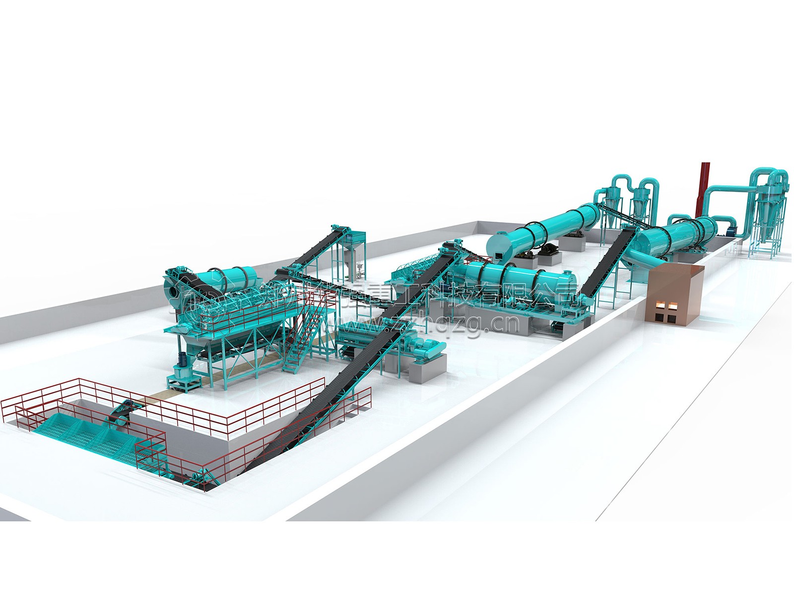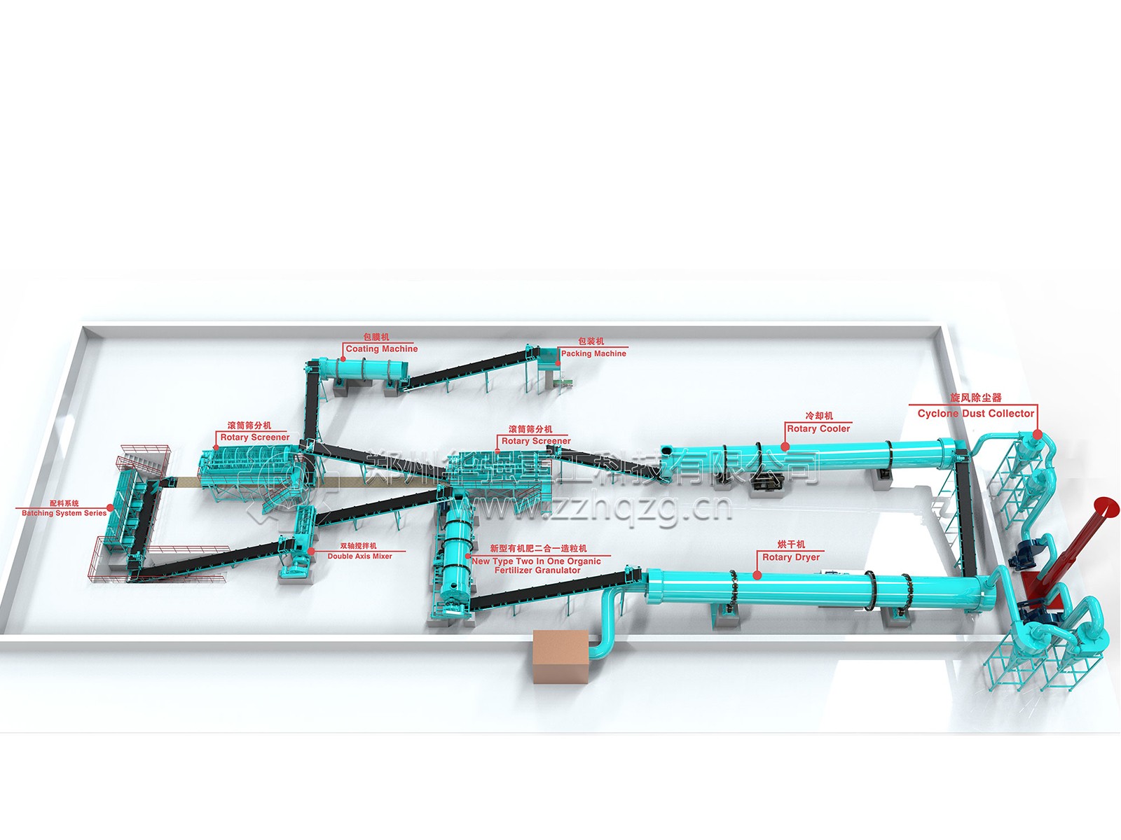 配料系統(tǒng)——雙軸攪拌機(jī)——新型有機(jī)肥二合一造粒機(jī)——烘干機(jī)——旋風(fēng)除塵器——冷卻機(jī)——滾筒篩分機(jī)——自動包裝機(jī)
