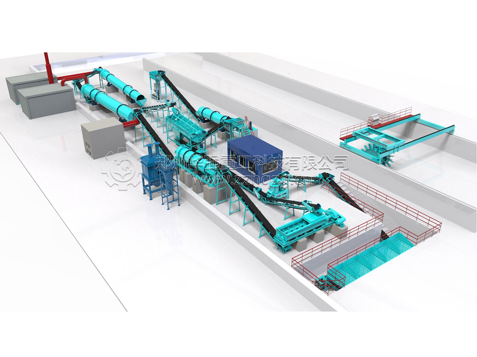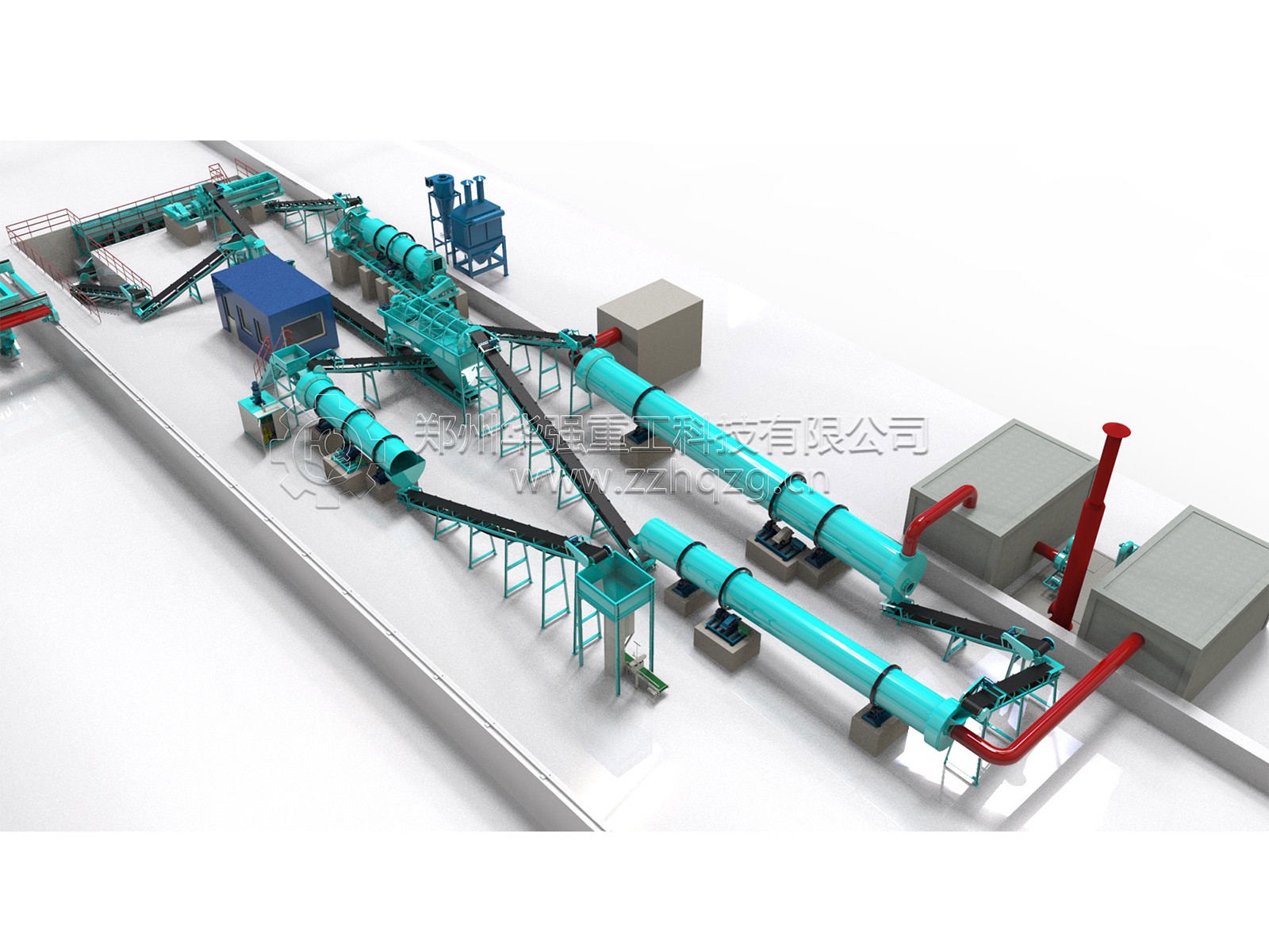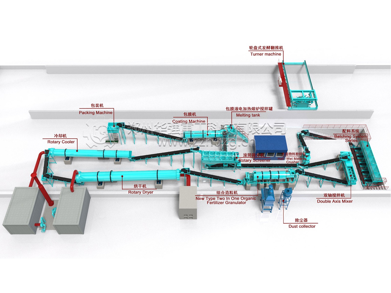 輪盤式發(fā)酵翻推機(jī)——配料系統(tǒng)——半濕物料粉碎機(jī)——雙軸攪拌機(jī)——除塵器——組合造粒機(jī)——烘干機(jī)——冷卻機(jī)——滾筒篩分機(jī)——包膜液電加熱熔爐攪拌罐——自動(dòng)包裝。