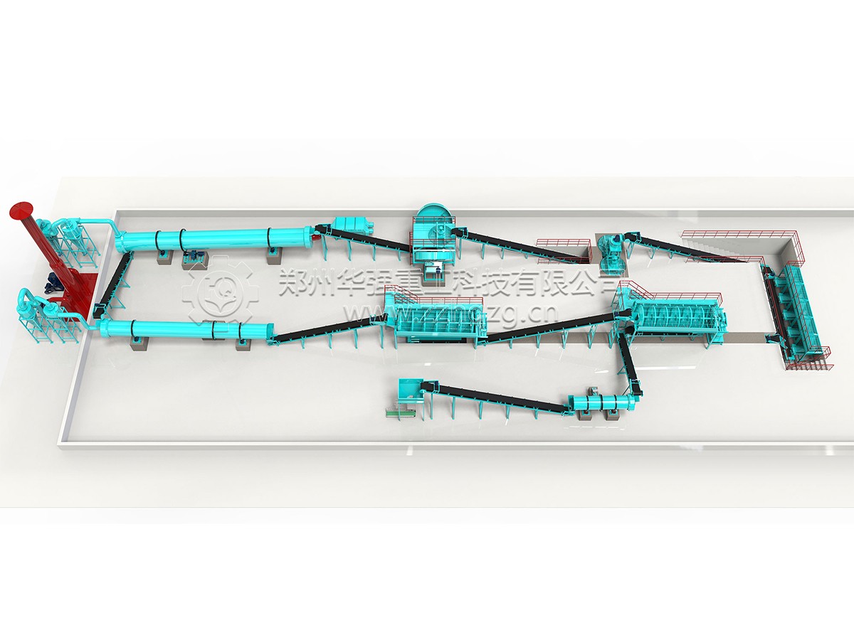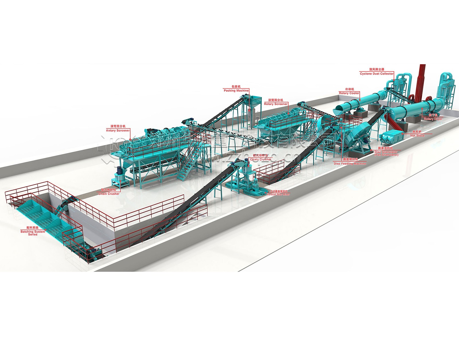 配料系統(tǒng)——鏈式粉碎機——立式圓盤攪拌機——圓盤喂料機——圓盤造粒機——熱風爐——烘干機——旋風除塵器——冷卻機——滾筒篩分機——滾筒篩分機——鏈式粉碎機——自動包裝機。